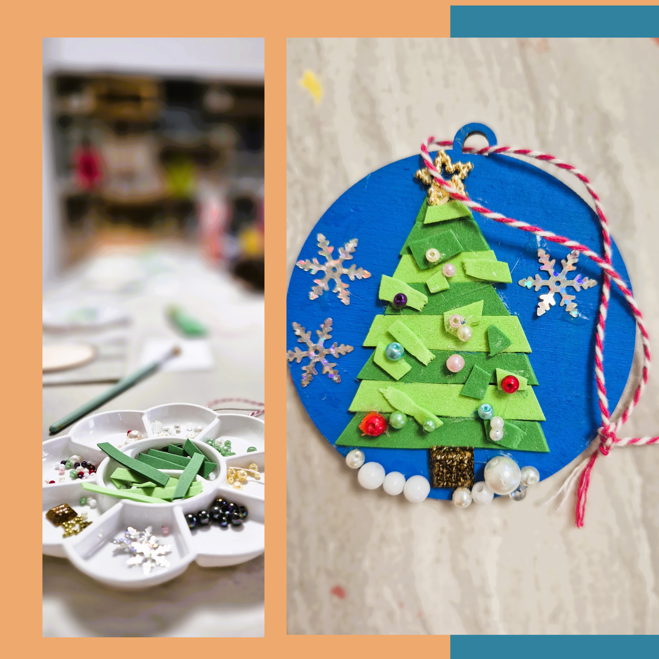 • Crearea de ornamente din diverse materiale (suport de lemn, decupaje fetru, mărgele, paiete, sclipici, panglici etc.)